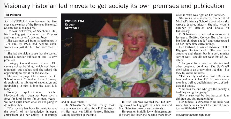 We all gained immensely from her change of direction to local history. Joan Schwitzer was a founder member of Hornsey Historical Society which was inaugurated in 1971. She served as chairman from 1974 to 1985 during which time she used her abilities, enthusiasm and energy to make the society an active force in the borough and in local history circles. As one of her referees has written, Joan had the vision to see that in order for the Society to play a significant role it needed to have both a regular publication and its own premises. Another comment labels the latter as 'her greatest achievement'. In the face of considerable opposition, she used her negotiating skills and her diplomacy to seize the opportunity to lease (at a peppercorn rent) from the local council a small redundant nineteenth century school building, then serving as a bus shelter. After organising and encouraging other members to fund-raise and volunteer in other ways, the Old Schoolhouse in Tottenham Lane has become a centre for the Society, for housing exhibitions, archives, publications storage, a shop, local history evening classes and oral history sessions.